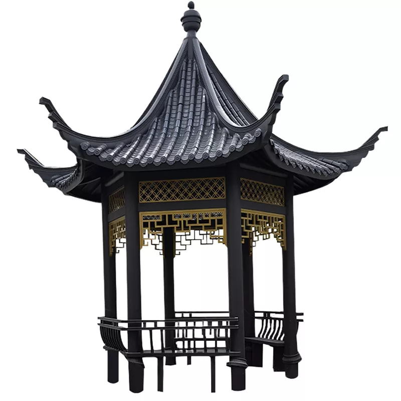 Реплика павильона в древнем стиле (5000 × 5000 мм): усиленные столбы 120 × 120 мм, конструкция «дугун», с полупрозрачными резными подвесными компонентами. Опционально используется трубчатая или глазурованная плитка, подходящая для культурных объектов и живописных мест.